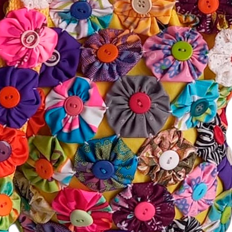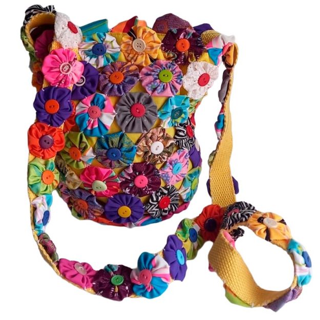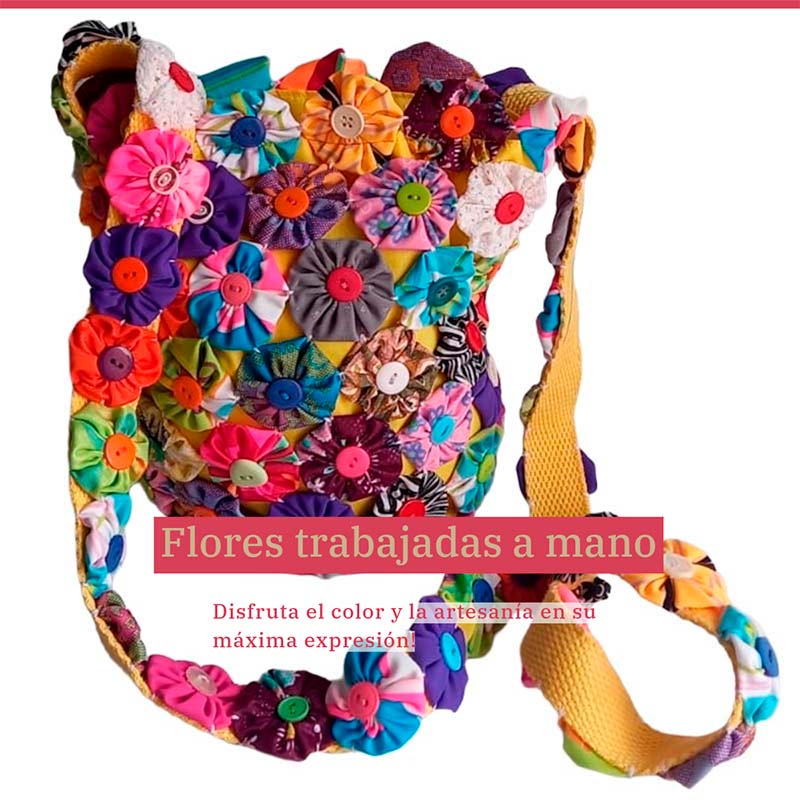 Bolso artesanal elaborado 100 % a mano con materiales reutilizados. Cada flor de tela y botón fue cuidadosamente cosida